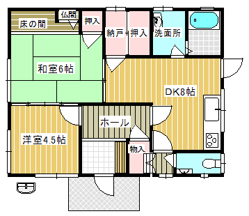 | 間取内訳 | DK(8帖)、和室(6帖)、洋室(4.5帖) |